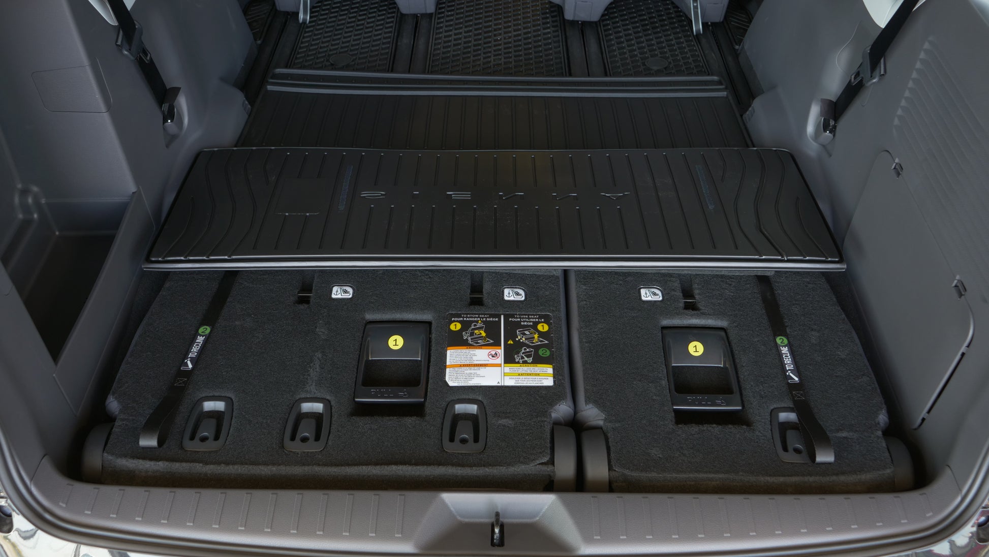 This model is a tri-fold liner when you're 3rd row seats are down it simply unfold to cover the backs of the seats